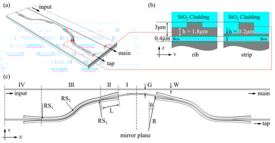 Figure 3a,b illustrate that the main path exclusively consists of the rib waveguide, whereas the tap path incorporates the rib profile in the coupling and straight regions, and utilizes the strip waveguide for the curved segment. A comprehensive description of the tap waveguide is provided in