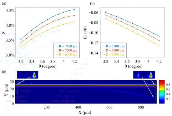 R grows, the shape of the curved waveguide approaches that of the straight waveguide, and this leads to an increase in the effective coupling length of the coupling region. As previously discussed, this consequence results in a narrower bandwidth, which is undesirable for the device’s performance. By taking all of these factors into account, we selected optimal values of