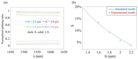 Figure 8a, normalized splitting ratios from 1470 nm to 1630 nm for different gap sizes are demonstrated. For the design focused on obtaining a 96%/4% splitting ratio, a tapping ratio of 5.753% at 1550 nm (red dash line) was attained, displaying a variation of −1.373% to 1.433% throughout the entire spectrum. Similarly, other designs with distinct gap sizes exhibit minor