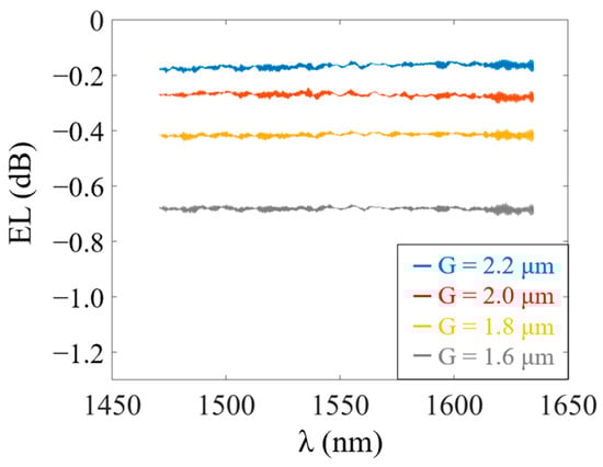 Figure 9, which displays measured values of −0.17 dB, −0.27 dB, −0.42 dB, and −0.68 dB at 1550 nm, respectively, when the gap size reduces from 2.2 µm to 1.6 µm. It is worth noting that in comparison to