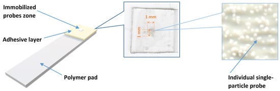 The concept of immobilized sorption-colorimetric microprobes proposed in this work implies the use of individual sorption elements (for example, individual particles of sorbent) or their small arrays for the extraction of colored analytical forms with subsequent registration of the colorimetric response directly on the surface of the microprobes. For the convenience of handling microprobes, an easy-to-made device was proposed (Figure 1), which uses an adhesive layer of double-sided adhesive tape to fix them on the plate. The number of applied microprobes can be controlled by using patterns with holes of different sizes and different sorbent filling densities. It was established that the microprobes are firmly held on the surface of the adhesive layer, and they are not washed off during their use, washing, and drying. The devices can be easily placed on the scanner glass and scanned at high resolution in both reflection and transmission modes.