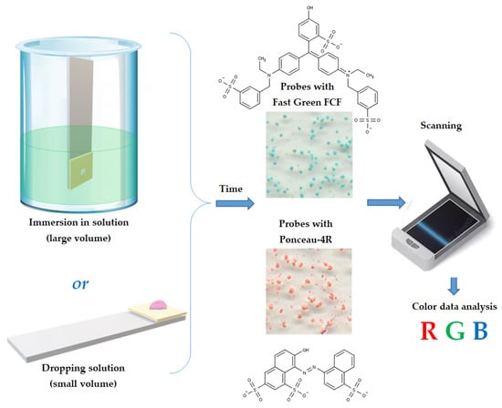 Scheme of immobilized sorption-colorimetric microprobes application (by the example of synthetic food dyes Fast Green FCF and Ponceau-4R). This figure has been designed using assets from Freepik.com.