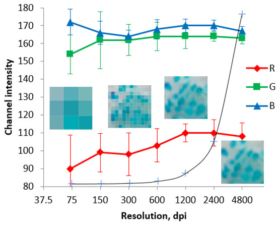 To optimize the conditions for recording the signal of microprobes, it is necessary to set the scanner resolution, at which the channel intensity values do not depend on it. The chosen resolution should also ensure the measurement of individual sorbent granules but should not lead to a strong slowdown in scanning and a significant increase in the file size. Figure 3 shows the change in channel intensities with increasing the scanning resolution. At low resolutions, individual microprobes cannot be recognized in the scanned image. Instead, a number of pixels possessing average intensity values between the microprobes and the background can be observed. Increasing resolution results in appearing images of the individual microprobes. Simultaneously their signals can be more effectively separated from the background. It can also be seen that the almost constant values of channel intensities are observed starting from 1200 dpi. At lower resolutions, the errors of the response measurement increase remarkably because of the small number of pixels in the image. At higher resolutions, a significant increase in the file size is noted without a remarkable increase in the image quality. Therefore, in further experiments, the scanning was carried out at the resolution of 1200 dpi.