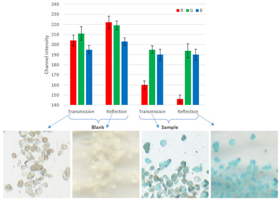 The effect of the scanning mode (transmission or reflection) on the quality of microprobes images and their response in the presence of an analyte was studied. The results are represented in Figure 4. In this figure, the left part of the histogram represents R, G, and B channel intensities for the blank microprobes recorded in the transmission and reflection mode. It can be seen that the reflection mode provides higher intensity values (brighter image). After the adsorption of FG (the right part of the histogram), all channel intensities decrease, and the R channel provides the highest change, i.e., the highest analytical response. Obviously, the reflection mode ensures the greatest difference between the blank and the probe in the R channel.
