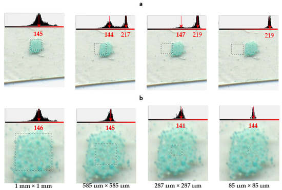 When measuring macroscopic amounts of sorbents, the colorimetric characteristics of the substrate have practically no effect on the recorded signal. In contrast to this variant, the layer of microprobes immobilized on an adhesive substrate is characterized by a small thickness and greater inhomogeneity. The immobilized sorption-colorimetric microprobes can be distributed unevenly and incompactly on the adhesive substrate. This makes it necessary to separate their signal from the signal associated with the background. For this purpose, it was proposed to carry out a colorimetric analysis using the histograms of the channel intensity distribution provided by the standard application of Adobe Photoshop. This possibility is illustrated in Figure 5a. In this figure, a square area marked with a dotted line is a region of interest (ROI), i.e., an area selected on the image that is used for calculating the average intensities of R, G, and B channels. Adobe Photoshop provides a histogram of intensity distribution for each of the three color channels. Examples of such distributions for R channels built for different ROI are shown in the top parts of each image in Figure 5.