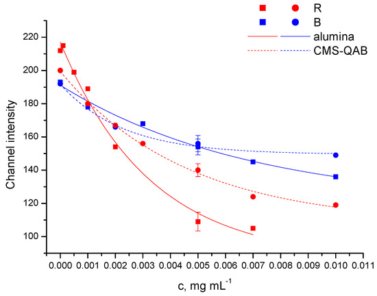 It was found that 30 min is sufficient to reach equilibrium. Calibration plots of channel intensities of the microprobes based on CMS-QAB and alumina on the concentration of dyes FG and P-4R were plotted (Figure 6). It was established that for CMS-QAB in the range of 0–0.01 mg mL−1 FG, the graph is well described (R2 = 0.996) by an exponent R = y0 + Ae−c/t, where R is the corresponding channel intensity, c is the concentration of FG, y0, A and t are parameters of the exponential fitting.