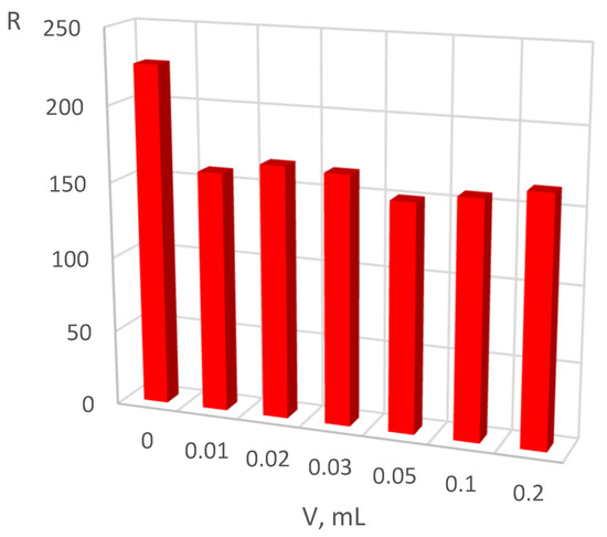 To assess the possibility of using microprobes to determine small-volume samples, the dependence of the analytical response on the sample volume was studied (Figure 7). To perform this, the solution of FG was applied to the microprobe by dropping. It was established that the colorimetric response, which is a decrease in the R channel intensity, is observed when applying even as low as 10 μL of the analyzed solution, and it remains constant with further increase in the volume. It can be explained by the small number of microprobes within the detection zone, resulting in a small amount of the analyte adsorbed. The quantity of adsorbed analyte is normally proportional to its equilibrium concentration in solution. The small amount of adsorbed dye means small changes in its concentration in the solution. Therefore, the colorimetric response does not depend on the volume of the solution.