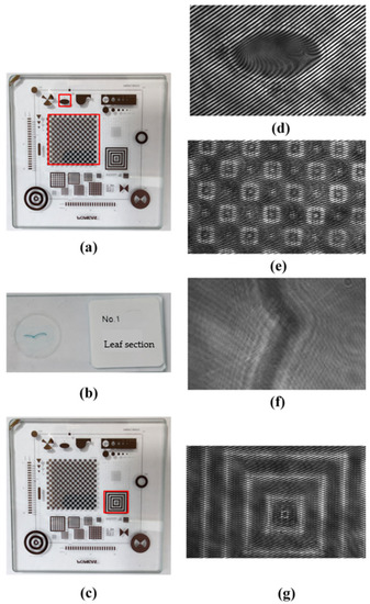In our experiments, we used the sample shown in Figure 3a,c and the leaf blade shown in Figure 3b as samples. Their corresponding holograms captured by the experimental setup are shown in Figure 3d–g, respectively.