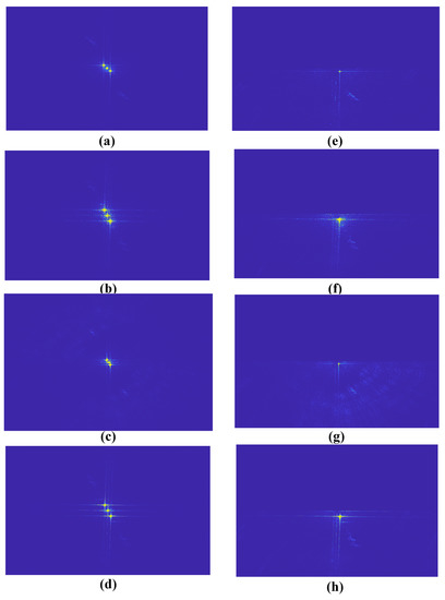 The frequency spectrum diagrams. (a) The frequency spectrum diagram of Figure 3d. (b) The frequency spectrum diagram of Figure 3e. (c) The frequency spectrum diagram of Figure 3f. (d) The frequency spectrum diagram of Figure 3g. (e) The frequency spectrum diagram of Figure 3d processed by the proposed method. (f) The frequency spectrum diagram of Figure 3e processed by the proposed method. (g) The frequency spectrum diagram of Figure 3f processed by the proposed method. (h) The frequency spectrum diagram of Figure 3g processed by the proposed method.