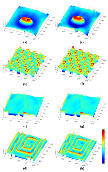 After numerical reconstruction, phase unwrapping, and phase correction of the holograms processed by the Haar wavelet transform, the final phase maps are shown in Figure 7a–d, respectively. By Laplace operator processing, the final phase maps are shown in Figure 7e–h, respectively. It can be seen that the reconstructed phase images processed by both methods suffer from significant phase deformation and high-frequency component loss. The elliptical projections in Figure 7a,e are both clearly missing, the lower left corner of the small raised pattern in Figure 7b,f is also missing, the specific outline in the middle part of Figure 7c,g can no longer be seen and the outlines of Figure 7d,h appear jagged.