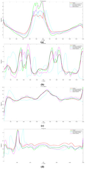 It can be seen from Figure 8a–d that the trend of the green dashed line, the blue point line and the yellow point line are basically the same as the trend of the red solid line. However, the experimental results show that the deviation of the blue dashed line from the red solid line at the peak is significantly smaller than the deviation of the green dashed line from the red solid line at the peak, the deviation of the cyan dotted line from the red solid line at the peak and the deviation of the purple dashed line from the red solid line at the peak. In particular, in Figure 8a, the deviation rate of the peak between the green solid line and the red solid line is 72.49%. The peak deviation rate between the blue dotted line and the red solid line is 13.3%. The peak deviation rate between the cyan dotted line and the red solid line is 17.27%. The peak deviation rate between the purple dotted line and the red solid line is 73.32%.
