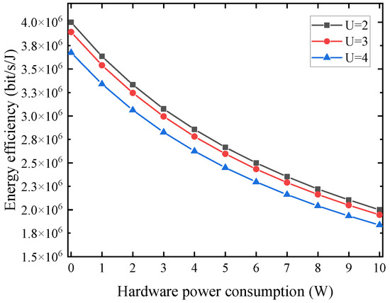 Figure 3 demonstrates EE with varying hardware power consumption and number of users. It is observed that EE decreases with increasing , which is due to an increase in circuit loss, leading to more total energy consumed in the system; however, this has no effect on other factors. From Equation (15), it can be seen that hardware power consumption only incurs an increase in net energy consumption without causing other changes; hence, EE decreases. Furthermore, as the number of users increase, EE decreases, which coincides with the previous simulation results.