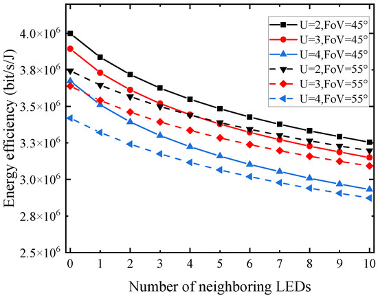It can be seen from Figure 4 that there is a negative correlation between the number of neighboring LEDs and EE, meaning that while adding the number of LEDs from zero to ten, the users are affected by more severe interference, resulting in a decrease in sum rate. Although, at the same time that the user can gather energy from the interfering LEDs, the change in the harvested energy is considerably less than the impact caused by the sum rate. The solid line in Figure 4 shows the FoV of 45° while the dashed line indicates the FoV of 55°. It can be seen that the overall EE at the FoV of 55° is less than the EE at the FoV of 45°, which is consistent with the previous results.