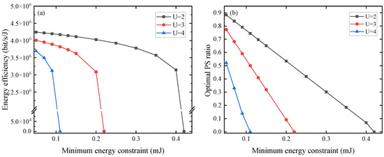 Figure 5 illustrates the maximum EE and the optimal PS coefficient for different minimum harvested energy requirements with the PS protocol. The optimal allocated power for each user is obtained through the first step of the PSO algorithm with a different number of users. Subsequently, the optimal PS coefficient is solved by Equations (21)–(23). The minimum harvested energy is set to 0.05–0.42 mJ. It shows that EE and the optimal power allocation ratio decline when the required harvested energy increases. In order to satisfy the minimum harvesting energy requirement, a larger power is required for energy harvesting, i.e., a smaller PS coefficient. A corresponding decrease in data rate leads to a decrease in EE. A power allocation coefficient of 0 indicates that the system is unable to satisfy the minimum harvested energy requirement while satisfying the minimum rate; hence, EE is 0.