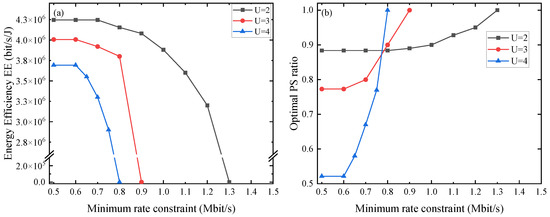 Figure 6 discusses the effect of the user’s minimum data rate on EE and optimal PS coefficient. In this simulation, we change the minimum data rate from 0.5 to 1.3 Mbit/s while the harvested energy is limited to 0.6 mJ. As the minimum data rate requirement increases, EE remains constant until a certain minimum rate requirement is achieved. When the minimum required rate increases to a certain level, EE drops. In order to achieve higher data rate requirements, the optimal PS coefficient is required to be increased. However, in this circumstance, the remote user is unable to satisfy the minimum harvested energy but has to increase the transmit power to ensure the harvested energy. It causes the system rate and EE to decrease. In the end, it is unable to satisfy the requirements no matter how to adjust the power. At this point EE is 0, so that we order the PS coefficient to be 1.