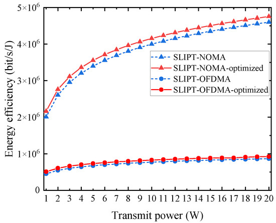 In the last simulation, we select two user systems as examples to provide a comprehensive understanding of the system’s performance. A comparative analysis was undertaken to assess the energy efficiency of the NOMA system with SLIPT and the OMA system with SLIPT in Figure 7. This assessment includes four distinct scenarios, namely before optimization and after optimization for both systems, showing the enhancement of optimization on energy efficiency. For the reason that the increment of the system sum rate is in excess of the increment of power consumption as the user’s transmit power changes in the range of 1–20 W, the energy efficiency appears as an increment with increasing total transmit power. In addition, it is clear that the EE in the SLIPT-enabled NOMA system of this paper is superior to the SLIPT-OFDMA system. The reason is that users in the NOMA system utilize the total bandwidth of the system and can achieve a higher data rate while each user in OFDMA only shares half of the bandwidth. This demonstrates that the SLIPT-enabled NOMA system can achieve a higher EE, which shows the strengths of applying SLIPT to NOMA systems. It can be inferred that the optimized system exhibits a superior energy efficiency due to the implementation of the proposed two-step PSO algorithm, thereby indicating the advantage of the approach described in this paper.
