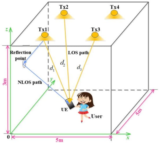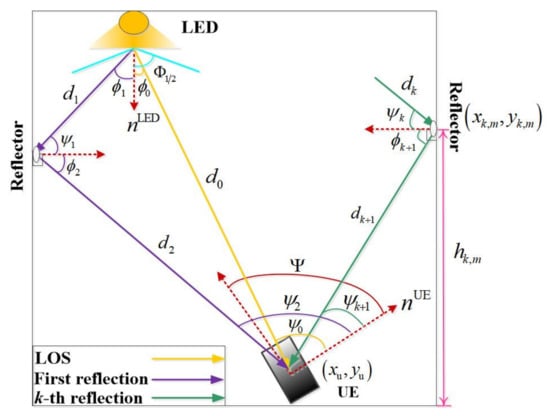 - Gu, W.; Aminikashani, M.; Deng, P.; Kavehrad, M. Impact of multipath reflections on the performance of indoor visible light positioning systems. J. Lightw. Technol. 2016, 34, 2578–2587. [Google Scholar] [CrossRef]