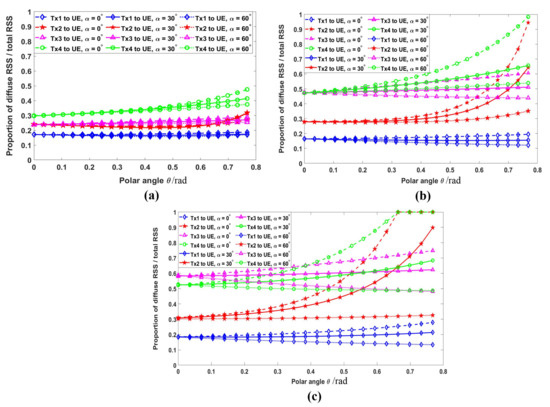 - Analysis of influence for random receiving orientation on the proportion of the diffuse component to the total received power, in which the influencing factors consist of the yaw, pitch, and roll angles;