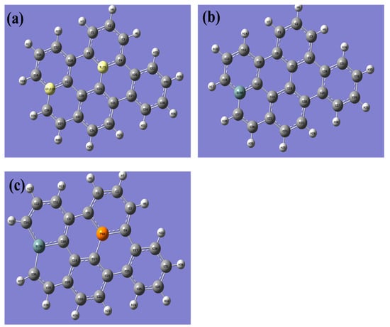 Doping with heteroatoms has proven to be the most effective method of controlling the band gap engineering, optical phenomena management, and structure-property tuning in graphene, opening up new possibilities in nano-optoelectronic applications, particularly in energy-related devices []. While impurities within graphene are frequent and random, the placement of dopants on the periodic structure of graphene has shown promising results in theoretical research [].
