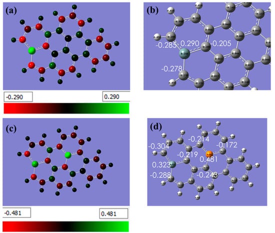 Shows the partial charge distribution with a color scheme, where the color bar represents the range of partial charges. Green indicates positive charges and red signifies negative charges. (a,b) In the case of Si-doped graphene, the by Natural Bond Orbital (NBO) analysis demonstrated a transfer of approximately −0.285 e, −0.278 e, and −0.205 e charges from Si to its neighboring C atoms. This indicates that Si is acting as an electron donor in the system, transferring electrons to the neighboring carbon atoms, (c,d) The same analysis but for graphene co-doped with silicon and phosphorus. This information provides insight into the electronic structure of the material and helps to explain the effects of the dopant on its properties. (The computational resources provided by the High Performance Computing (HPC) Cluster at UNC Charlotte).