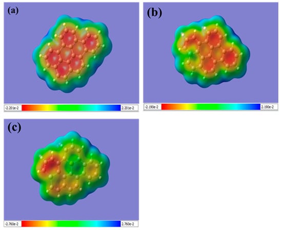 For pristine graphene, the top surface has a negative charge, represented by the red color (see, Figure 3a). The edges of the graphene sheet are indicated by a positive charge, represented by the blue color. This is due to the delocalization of the electrons over the whole graphene sheet, which results in a uniform distribution of electron density, while the positively charged hydrogen atoms at the edges are attracted to the negatively charged carbon atoms.