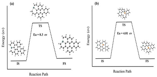 The energy diagram in Figure 5 illustrates the energy changes that occur during the diffusion process, indicating the energy barriers that need to be overcome for the dopant atoms to move from one position to another on the graphene sheet. The energy barrier, which is represented by the transition structure, indicates the minimum amount of energy required for the dopant atoms to move from the initial position to the final position.