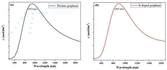 Depicts the UV-Vis absorption spectra obtained from TD-DFT simulations at the B3LYP/6-31G (d, p) level. Here, we give the spectra for (a) pristine graphene and (b) silicon-doped graphene, as measured by the absorbance coefficient (ε), which is the imaginary part of the dielectric function. The spectra show a blue shift, indicating a decrease in the maximum absorption wavelength, with a shift towards shorter wavelengths. (The computational resources provided by the High Performance Computing (HPC) Cluster at UNC Charlotte).
