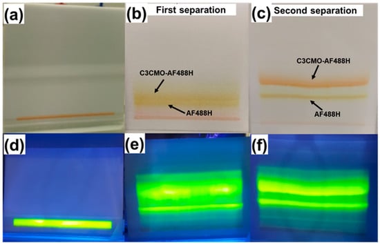 PTLC plates: (a) before being placed inside the eluent chamber; (b) first separation of tagged cortisol from reactants and by-products; (c) second separation of tagged cortisol from reactants and by-products; (d–f) are the images of (a–c) in 365 nm illumination.