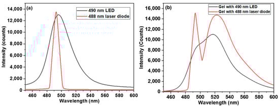 (a) The output spectra of the 490 nm LED and 488 nm laser diode. (b) The spectra of the 490 nm LED and 488 nm laser diode together with AF488H fluorescence after passing through the C3CMO-AF488H-containing hydrogel.