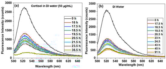 First, we fabricated two 3D-printed compartments connected with POF and containing gel, including aptamer and tagged cortisol. Figure 6a shows the fluorescence spectra at different times when the sensing compartment was immersed in the cortisol solution (50 µg/mL). Similarly, Figure 6b shows fluorescence spectra in the presence of pure DI water. The fluorescence signal intensity decreased with time in the cortisol solution (50 µg/mL) and DI water.