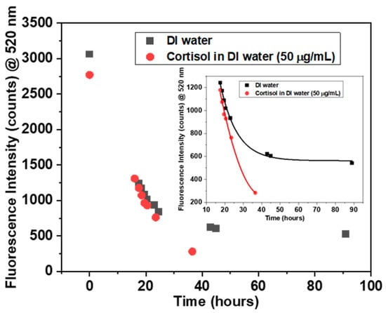 The signal intensities at different times were extracted at the emission wavelength of the AF488H (520 nm) from Figure 6 and plotted. Figure 7 shows this plot of the fluorescence intensity variation of the sensor in DI water and cortisol solution with time. Initially, in Figure 7, the rate of change of fluorescence intensity appeared similar for cortisol solution and DI water until 20 h of exposure. After 20 h, the rate of change of fluorescence intensity in the presence of cortisol solution was faster compared to that of the DI water sample. The inset of Figure 7 shows that the variation of the fluorescence intensity in the presence of cortisol solution was almost linear, while in the presence of DI water, the fluorescence variation was almost saturated after 40 h. There are two possible reasons for this kind of fluorescence variation. For the initial 20 h, the rate of change of fluorescence in the presence of DI water and cortisol solution showed a similar trend due to the leaching of the unbound AF488H-tagged cortisol molecules from the hydrogel.