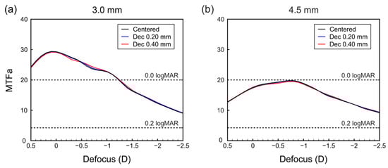 MTFa defocus curves of the IOL centered and horizontally decentered towards the temporal side for (a) 3.00 mm pupil and (b) 4.50 mm pupil. Horizontal dashed lines are the logMAR values of the VA predicted by Equation (1).