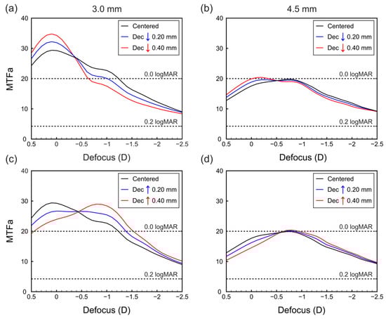 MTFa defocus curves of the IOL when vertically decentered (a) downward for 3.00 mm pupil, (b) downward for 4.50 mm pupil, (c) upward for 3.00 mm pupil, and (d) upward for 4.50 mm pupil. Horizontal dashed lines are the logMAR values of the VA predicted by Equation (1).