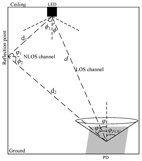 In this study, according to the actual indoor environment, the LOS link and the NLOS link with primary wall reflection are considered. The communication link is shown in Figure 2. Assuming that the luminous intensity of LED obeys the Lambert radiation model, the channel gain in the LOS link can be expressed as [17]: