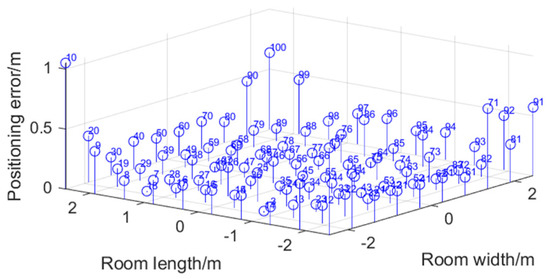 When the SNR is 30 dB, the distribution of the positioning error of 100 points to be measured is shown in Figure 8, the numbers marked in the figure are the serial numbers of the points to be measured which are evenly selected. It can be seen that the error in the middle area of the room is small, and the error in the corner and edge areas is large. Compared with Figure 7, it can be seen that this is due to the increase in the error caused by the gradual increase in the specific gravity of the scattering component, and the multipath effect will cause the positioning error of the corner and the edge to greatly deteriorate. According to the system simulation calculation, the average positioning error of the whole room is 20.26 cm, and the maximum error at the corners which is greatly affected by reflected light is about 1.15 m. Then, the traditional fingerprint positioning method is improved and its performance is verified.