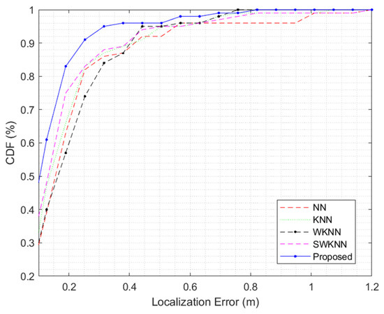 In order to further evaluate the localization performance of the proposed system, it is compared with the classical algorithm. Figure 12 shows the cumulative distribution function (CDF) of positioning errors of the different algorithms. The results show that the combination of the fusion clustering algorithm and the WOKNN algorithm has higher positioning accuracy than other algorithms. Especially, when the cumulative positioning error distribution is 90%, the average positioning error of NN is 0.43 m, while the error distance of the proposed algorithm is 0.24 m, and the positioning performance is improved by 44.2%, which is obviously improved as a whole.