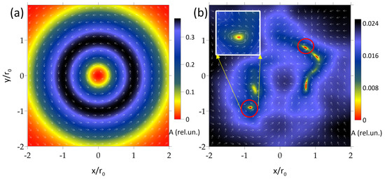 Amplitude profile A (color surface) and Poynting vector field s (arrows) of a vortex beam with m = 2 (a) at the optical path beginning and (b) after 10 m propagation in turbulent air. Red circles mark the phase singularities. One of them is presented as a close-up picture in the upper left corner in (b).