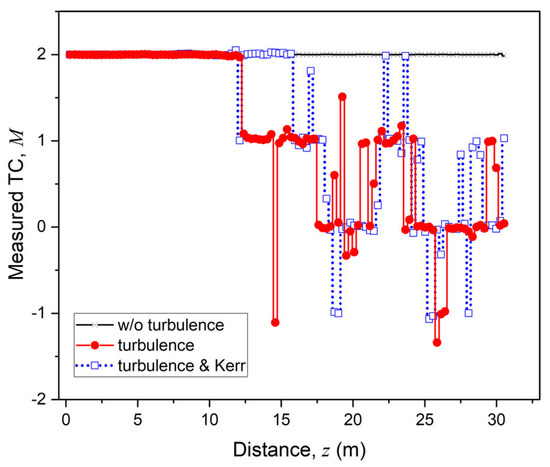 As seen, the effect of medium turbulence on the TC of propagating a vortex beam manifests itself in the TC changing and even vanishing if measured on the receiver. Moreover, the TC can become fractional or even change its sign (negative). The addition of Kerr nonlinearity partially compensates for the turbulent changes in TC especially at the earlier stage of beam propagation.