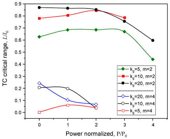 Critical range (L) for the initial beam TC loss relative to the nonturbulent linear air (l0) at pulse power P0 = 3 GW (kg is given in cm−1).