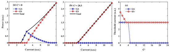Normalized output power as a function of normalized the injection current for a QDL without optical feedback under Ce = 0 (a) and Ce = 20.3 (b), respectively, and threshold currents of ES and GS as a function of Ce (c).