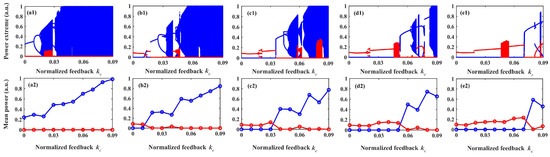 Bifurcation diagrams of power extreme and mean power as a function of feedback intensity of GS (blue) and ES (red) in QDL biased at 3.5 under optical feedback with τ = 100 and (a) Ce = 0, (b) Ce = 5, (c) Ce = 10, (d) Ce = 15, (e) Ce = 20.3, respectively.