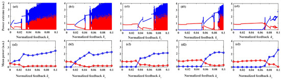 Figure 5 shows the bifurcation diagrams of power extreme and mean power of the GS (blue) and ES (red) as a function of kc under injection current J = 5.7 and delay time τ = 100. For Ce = 0 (Figure 5(a1)), the GS and ES are stable under kc < 0.023. When kc is within the range of (0.023, 0.025), the GS and ES show various dynamical states such as P1, P2, and MP oscillation. When kc exceeds the values 0.034, the GS and ES enter C oscillation. When Ce = 5 (Figure 5(b1)), only the ES emits under kc < 0.018. When kc is located within the range of (0.018, 0.04), the GS starts emission and the GS and ES are S. The GS and ES exhibit multiple dynamical states, including P1, P2, and MP, under the range of (0.04, 0.042). When kc is within the range of (0.042, 0.1), the GS and ES evolve from S to C oscillation. When Ce = 10 (Figure 5(c1)), only the ES emits under kc < 0.037. With the increase in kc from 0.037 to 0.065, the GS and ES behave as S. Once kc exceeds 0.07, the GS and ES evolve into C oscillation. When Ce = 15 (Figure 5(d1)), the ES is S under the range of kc (0, 0.055). When kc is located within the range of (0.055, 0.075), the GS and ES show rich dynamical states, including P1, P2, and MP oscillation. When kc exceeds 0.075, the GS and ES enter C oscillation. As shown in Figure 5(e1), when Ce = 20.3 (corresponding to the room temperature), only the ES emits for kc < 0.065. When kc is within the range of (0.065, 0.098), the GS and ES emit simultaneously and multiple dynamical states such as P1, P2, and MP oscillations can be observed. When kc is located within the range of (0.098, 0.1), the GS emission operates at S, while the ES emission is suppressed. By comparing the bifurcation diagram of power extreme and mean power under different Ce, it can be found that the GS and ES always have the same dynamic evolution with the increase in kc. For a relatively large Ce, a lower kc is more favorable for the ES emission, and a stronger kc is more favorable for the GS emission. Similarly, in the case of QDL biased at 3.5, for a larger value of Ce (corresponding to a higher temperature), the chaos state can be observed within a narrower region of the feedback strength.