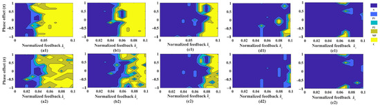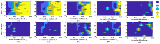 For J = 5.7, the corresponding results are given in Figure 7. For Ce = 0 (Figure 7(a1,a2)), the dynamical states of GS and ES include S, P1, P2, MP, and C oscillation. In the dwhole parameter space, a small number of regions are located at S. For Ce = 5 (Figure 7(b1,b2)) and Ce = 10 (Figure 7(c1,c2)); there are also multiple dynamical states, such as S, P1, P2, MP, and C oscillation, and the C region is shrunken compared with that under Ce = 0. For Ce = 15 (Figure 7(d1,d2)) and Ce = 20.3 (Figure 7(e1,e2)), the S region of GS and ES widens in the whole space and other dynamic states of the region become smaller. From Figure 6 and Figure 7, it can be concluded that the dynamical states distribution of GS and ES in the parameter space of optical feedback intensity and phase offset is strongly dependent on the parameter value of Ce.