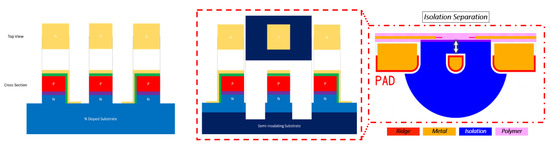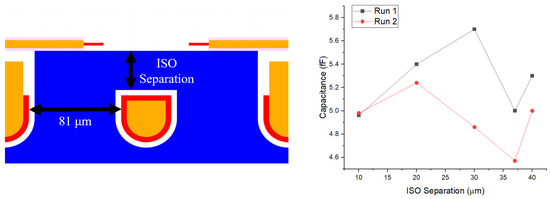 On the left is a closer look at the test structure used to measure the pad capacitance. The isolation separation is highlighted. On the right is the collated result of the pad’s capacitance with varying isolation separation.