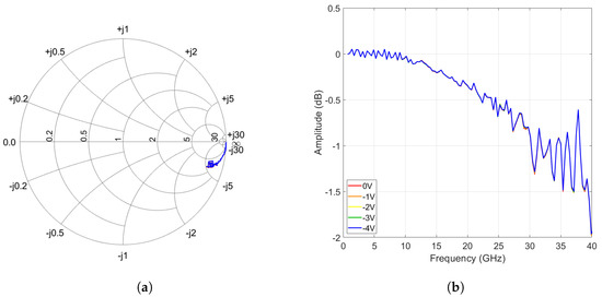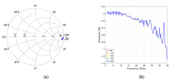 This isolation prevents charge build-up below the signal contact, eliminating the capacitance between the signal contact and the n-doped layers. A test structure shown on the right of Figure 3 was characterised by measuring the scattering matrix from 0–40 GHz using an Anritsu vector network analyser (VNA). The measured complex impedance values were then fitted to an inductor–resistor–capacitor (LRC) circuit as described in the previous section with the extracted capacitance being ≈5 fF for the device. Figure 4a shows the measurements from the test structure as a Smith chart and Figure 4b shows the magnitude vs. frequency for the test structure.