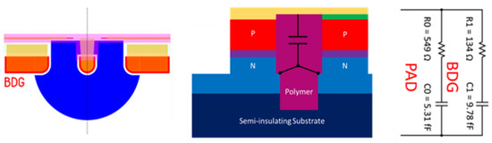 The impedance of the pillars to the ridge waveguide was quantified using a test structure as show in Figure 6 wherein the metal bridge sits atop a pillar of BCB. Using the equivalent circuit model fitted to the already-measured data of the contact pads shown previously, measurements of this test structure were able to isolate the parasitic capacitance exclusive to the metal bridge. The metal bridge forms a pair of capacitor plates with the lower n region remaining following the deep isolation etch as shown in the figure below. Figure 7a shows the measurements from the test structure as a Smith chart and Figure 7b shows the magnitude vs. frequency for the test structure. The parasitic capacitance of the bridge was experimentally verified via analysis to be ≈10 fF.