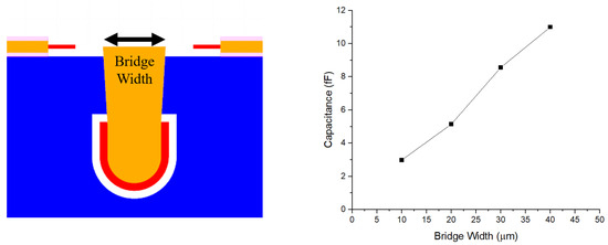 On the left is a closer look at the test structure used to measure the bridge capacitance. Red is the ridge definition, gold is metal, blue is the isolation etch. The bridge width is highlighted. On the right is the collated result of the bridge’s capacitance with varying bridge width.