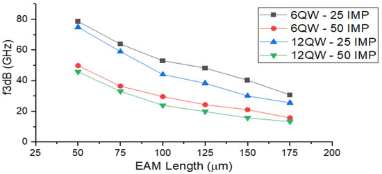 EAMs were fabricated with various lengths on two different materials, one with twelve quantum wells, and one with six quantum wells and a widened separate confinement hetero-structure layer. measurements were then made on these devices. Using the test structures present in the previous sections, the parasitic capacitance of the EAM device was able to be isolated from the capacitance of the EAM itself. Using Equation (6), values were calculated with inputs from over sixty different EAM measurements. s were calculated for over 60 EAM devices of varied lengths for both materials. Experimental s were not obtained due to a lack of input and output facets on the test devices. Figure 9 shows the result of one of these simulated s calculated using data from an EAM made from the material with six quantum wells. This EAM had a length of 50 m and a width of m. Figure 10 shows the averaged result of these calculations which predicts a bandwidth of near 80 GHz for a 25 impedance-matched EAM of length 50 . The simulated values presented for the do not take into account the wavelength and injected power dependence of the of an EAM; however, the results confirm that an improvement in the can be achieved through the optimisation of the electrical contact scheme used for the EAM.