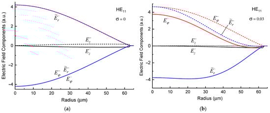 For the coreless fiber (Figure 3a,b), the HE11 modes have a cosine shape ( Bessel function) profile inside the cladding and exponentially decreasing in the outer space. and have opposite signs but almost the same absolute values. With increasing twist rate, the profiles of different components no longer coincide, which means that the linear polarized mode cannot be obtained by combining two circularly polarized modes. For the right circularly polarized mode, the azimuthal component is repelled from the cladding surface with strongest shear strain closer to the center. The radial component is, on the contrary, attracted closer to the cladding surface. For the left circularly polarized mode, the shifts of the profiles are inverse and somewhat weaker. It is interesting to note that the component changes its sign near the surface, while vanishes. Therefore, twisting may result in the modification of surface sensitivity of the fiber to the external medium, which can be important for sensing applications.
