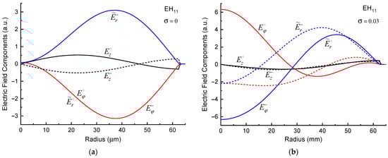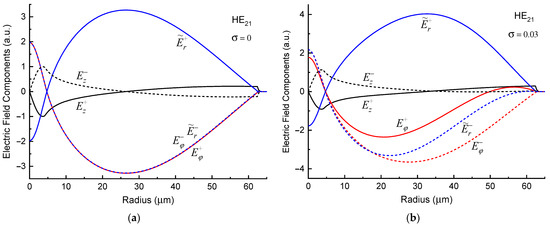 We calculated the electric field profiles of various HE1ν and EH1ν cladding modes for the coreless and standard fibers. The components of the electric field for pristine fiber with no twist and twisted fiber with are depicted in Figure 3 as functions of radius. The radial component of the electric field is imaginary; therefore, is shown. The mode fields are normalized to the same energy flux along the z axis.